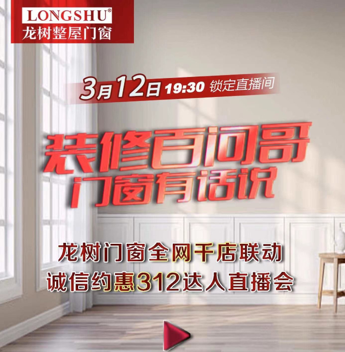 來啦來啦~。它帶著大波福利和優惠政策來啦,大勢興商,千萬有你!2024年3月12日19:00-21:00,龍樹整屋門窗通過線上直播召開「龍樹門窗全網千店聯動誠信約惠312達人直播會」造富合伙人招募計劃,鎖定龍樹全網訂單星推官,裝修百問哥直播間、龍樹官方企業店直播間,雙號直播!在這個開春的3月,龍樹整屋門窗帶著新商專屬福利來襲,現場直播發布新商多重權益,直播豪禮享不停,當然不容錯過!